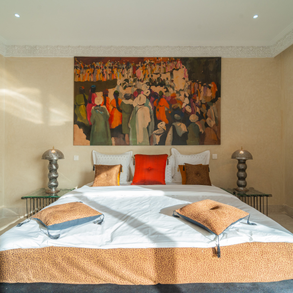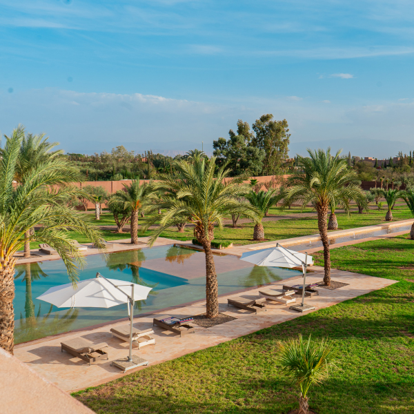 This Arab-Andalusian palace is located on a private estate just 11 kilometers from the center of Marrakech. Nestled within a 2-hectare park of palm trees, olive trees, and fruit trees, its refined décor and breathtaking views of the Atlas Mountains make it an exceptional place.